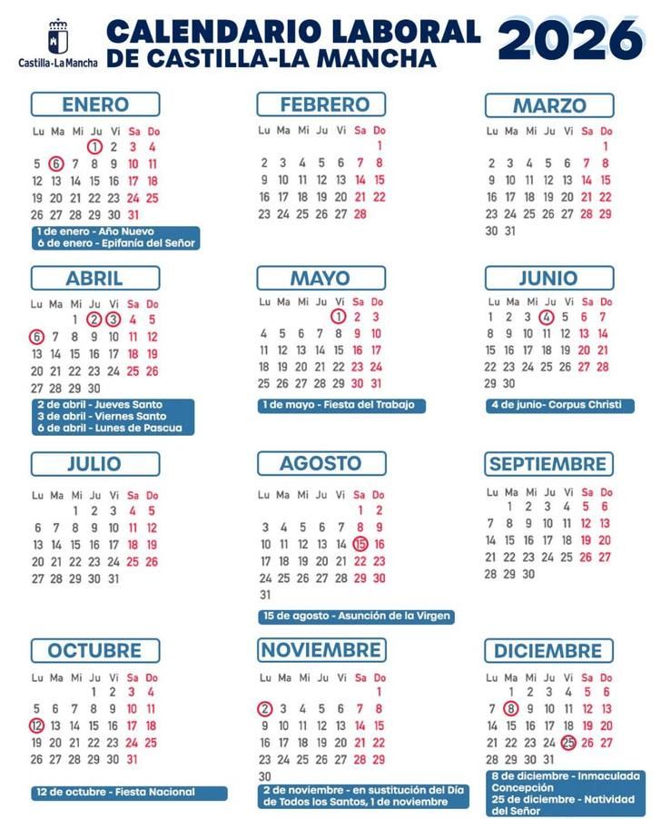En el año 2026, se celebrarán días festivos en toda España. Las fechas que serán consideradas fiesta son las siguientes: el jueves 1 de enero (Año Nuevo), el martes 6 de enero (Epifanía del Señor), el viernes 3 de abril (Viernes Santo), el viernes 1 de mayo (Fiesta del Trabajo), el sábado 15 de agosto (Asunción de la Virgen), el lunes 12 de octubre (Fiesta Nacional de España), el domingo 1 de noviembre (Fiesta de Todos los Santos), el martes 8 de diciembre (Día de la Inmaculada Concepción) y, por último, el viernes 25 de diciembre (Natividad del Señor).