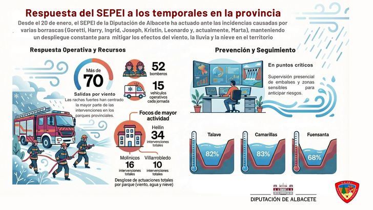 Desde el 20 de enero, el SEPEI de Albacete ha respondido a las incidencias provocadas por borrascas que han afectado la provincia. Con más de 70 intervenciones y un equipo constante de 52 bomberos, se ha priorizado la planificación y prevención para garantizar la seguridad ante fenómenos meteorológicos adversos.