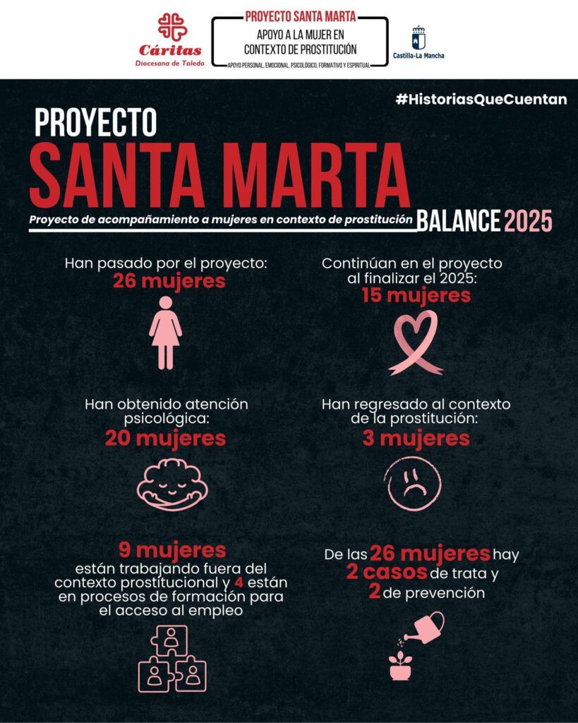 El programa Santa Marta de Cáritas Diocesana de Toledo ha ayudado a nueve mujeres a encontrar empleo tras dejar la prostitución, enfocándose en víctimas de trata. En el último año, 26 mujeres participaron, con apoyo financiero de la Junta. El proyecto se basa en atención psicológica, necesidades básicas y formación laboral.