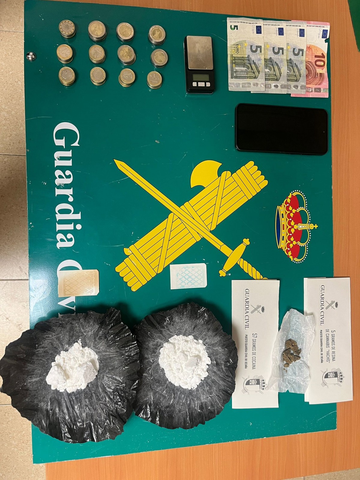 Agentes del Puesto de la Guardia Civil de Ocaña han llevado a cabo la detención de un hombre, presuntamente implicado en un delito contra la salud pública por tráfico de drogas. La captura se produjo cuando el individuo fue sorprendido en la vía pública con 57 gramos de cocaína en roca y una cantidad fraccionada de dinero en efectivo, que se sospecha proviene de la venta de la sustancia.