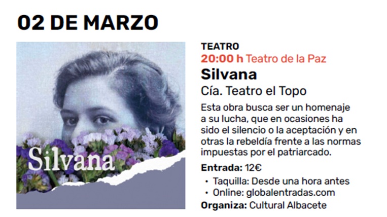 Añadiendo más actividades culturales, el recital La mujer en la poesía, dirigido por Llanos Salas, tendrá lugar el 19 de marzo a las 19:00 horas en la Biblioteca Depósitos del Sol. Además, el día siguiente se organizará una actividad denominada Lectura y recital, coordinada por la Asociación Entrepuntejos.