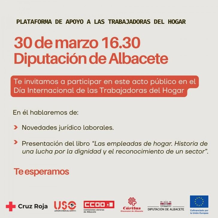 En el marco del Día Internacional de las Trabajadoras del Hogar, que se celebra el 30 de marzo, la Plataforma de Apoyo a las Trabajadoras y Trabajadores del Hogar de Albacete ha programado un evento en el salón de actos de la Diputación de Albacete a las 16:30 horas. Este acto tiene como objetivo apoyar y unirse a las demandas de un colectivo que busca garantizar sus derechos laborales y dignificar sus condiciones.