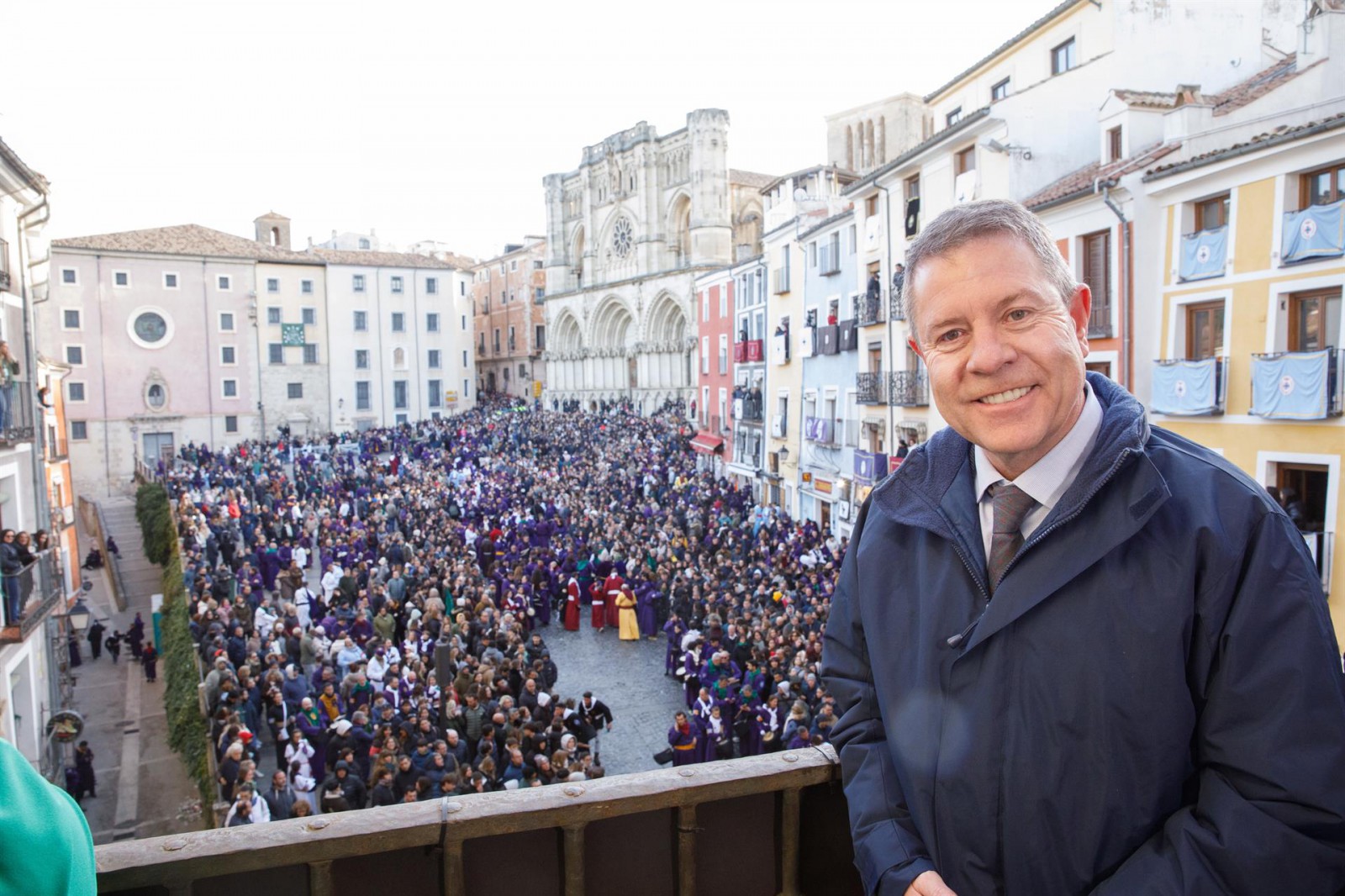 El mandatario regional participó en la procesión conocida como 'Las Turbas', donde estuvo acompañado por el consejero de Educación, Cultura y Deportes, Amador Pastor. Desde el Ayuntamiento de Cuenca, observó cómo la turba llegaba a la Plaza Mayor, guiado por el alcalde Darío Dolz.