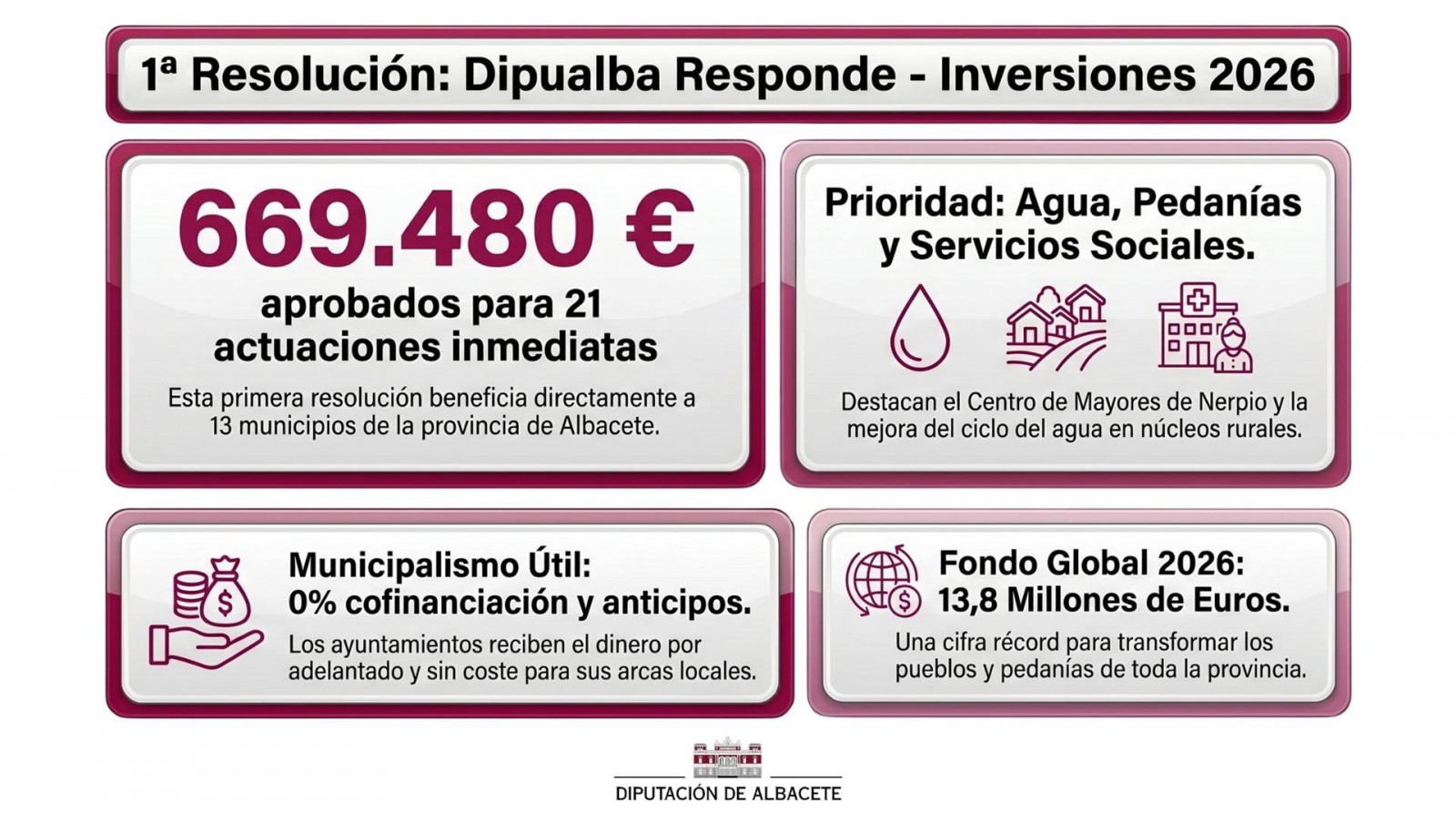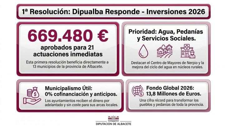 La Diputación de Albacete ha dado luz verde a la primera resolución del programa 'Dipualba Responde-Inversiones 2026', que destina un total de 669.480 euros a un conjunto de 21 actuaciones. Esta inversión beneficiará directamente a 13 municipios de la provincia, entre los que se encuentran Peñas de San Pedro, Villa de Ves, Villaverde de Guadalimar, Ossa de Montiel, Bogarra, San Pedro, Molinicos, Barrax, Nerpio, Casas-Ibáñez, El Ballestero, Letur y Pozo Cañada.